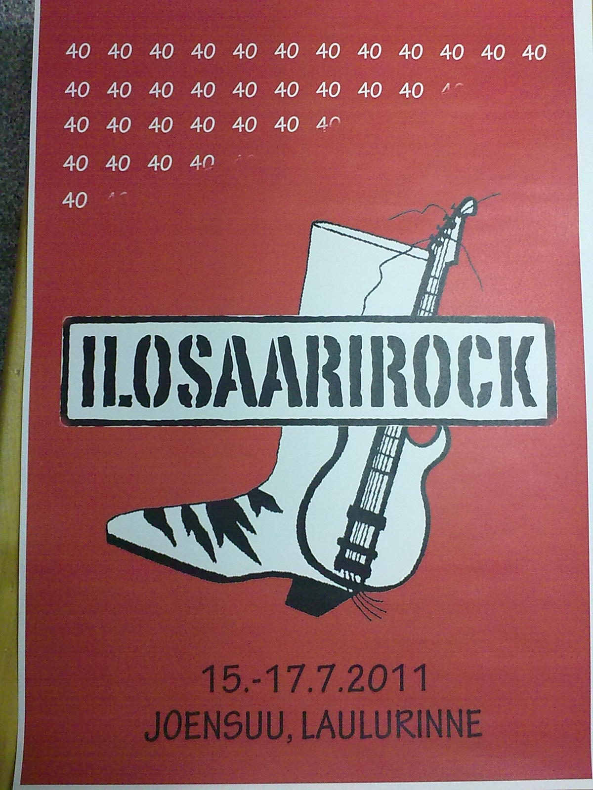 Ai niin, syksyllä yritin uutta aluevaltausta ja osallistuin Ilosaarirockin vuoden 2011 kuvailmeen luomiseen. Palkintokin olisi ollut 2000 € ja VIP-liput paikan päälle (Minäkö Joensuuhun festareille??). No, ihan en onnistunut haluttua fiilistä luomaan, mutta näytän nyt kuitenkin pienelle lukijakunnalleni kolme ehdotustani 40v täyttävälle tapahtumalle. (Seuraavaksi osallistun tähän kisaan: http://www.pirkka.fi/kilpailut/thekenka !!! Eikä tämänkään linkin otsikossa ole kuin yksi väärä kirjain ;-) http://www.newshoes2012.com/, äääh, ikäraja 16-35.)